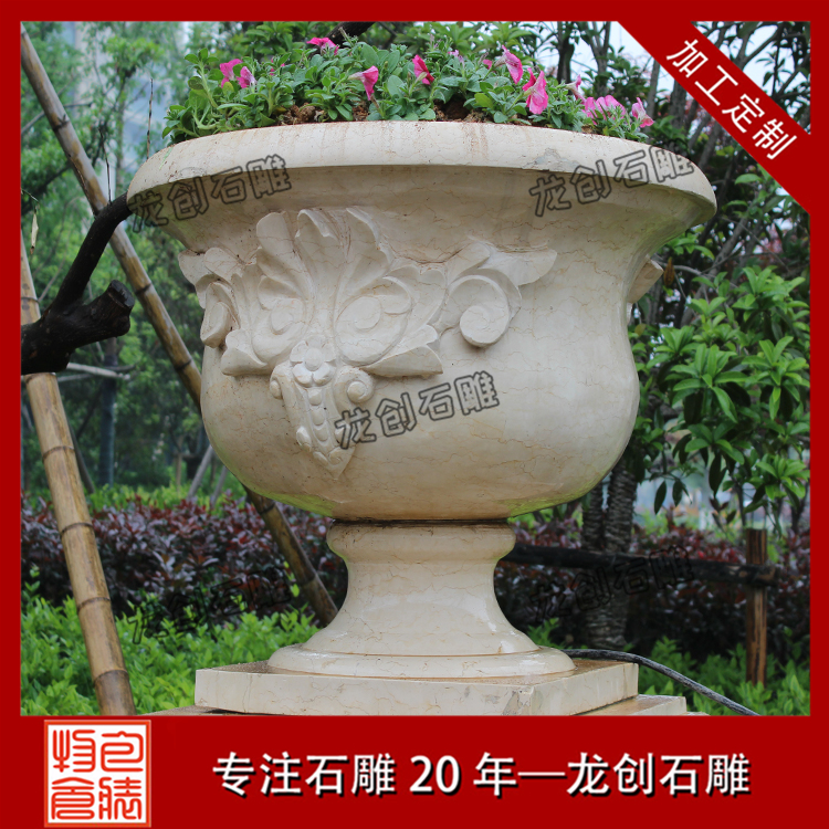 石雕花盆為什么那么受人們喜愛呢?石雕花盆擺放有哪些作用呢?原因就是石雕花盆不僅能靈活移動,操作方便,還有很好的裝飾效果。石雕花盆質(zhì)地堅硬致密、強度高、抗風化、耐侵蝕、耐磨損、吸水性低,鮮明的色澤還能保存百年以上,顏色美觀。 石雕花盆作為新型的花卉應用形式,擁有其它花盆無法達到的特定優(yōu)勢,與花壇相比,石雕花盆靈活,大部分都可以移動。