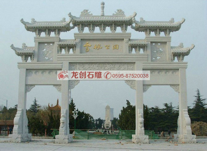 門樓牌坊雕刻的樣式,門樓牌坊設計時沒有樓的構造,既沒有斗拱和屋頂,而門樓牌坊設計時有斗拱和屋頂,它有更大的烘托氣氛。但是由于它們都是我國古代用于表彰、紀念、裝飾、標識的一種建筑物,而且多用于主要街道起點、交叉口、橋梁,古代多用于宮苑、寺觀、祠堂、衙署等處,景觀性很強,起到點題、框景、倩景等效果,長期以來老百姓對“坊”、“樓”的概念不清,所以到最后兩者成為一個互通的稱謂了。牌坊石雕、石雕牌坊、牌坊,現在很多石雕廠為了利益把石雕之本已經拋棄了,他們建造的門樓牌坊都是為了應時之景,雕刻工藝粗糙,已經徒有其表,門樓牌坊原本的神采和韻味乃至意義都不復存在。