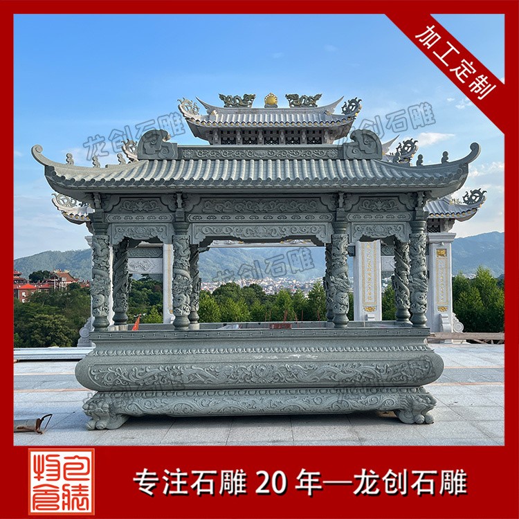 適用場景:青石石雕香爐在寺廟、宗祠等宗教場所中非常常見,其古樸典雅的色調能夠營造出莊重肅穆的氛圍。