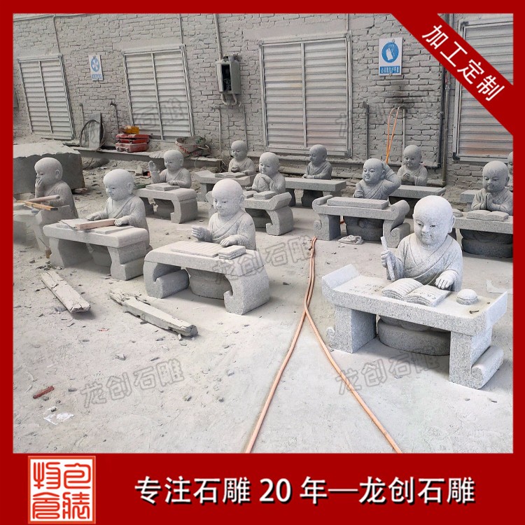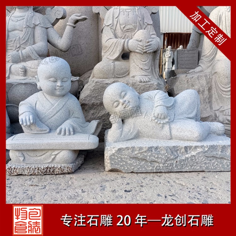 石雕小沙彌擺件造型有做早課晨練的小石雕、有拿著掃把在打掃的小石雕、也有著躺在樹下偷懶的小石雕等等,這些都是根據(jù)小和尚這種人物來做成的石雕,也是深受社會上很多人喜歡的。這種石雕的類型在制作上雖然不如一些大和尚石雕那樣莊嚴(yán)、慈悲,但是有著屬于他們年齡特點的一些制作雕刻。