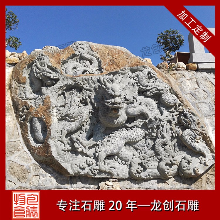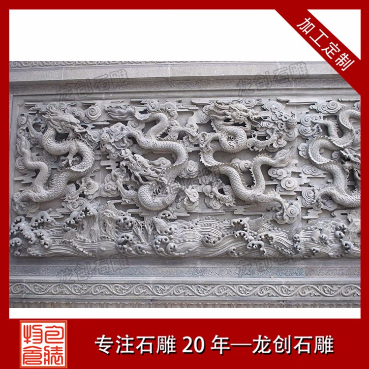 寺廟龍浮雕是我國特有的建筑形式,有一龍壁、三龍壁、五龍壁、七龍壁、九龍壁等多種形式,而以九龍壁zui為尊貴。九龍壁通常建在帝后、王公居住或經常出入的宮殿、王府、寺院等建筑正門的對面,是我國照壁建筑的進一步發展。九龍壁石雕浮雕壁畫常見于寺廟、廣場、政府等各場地。
