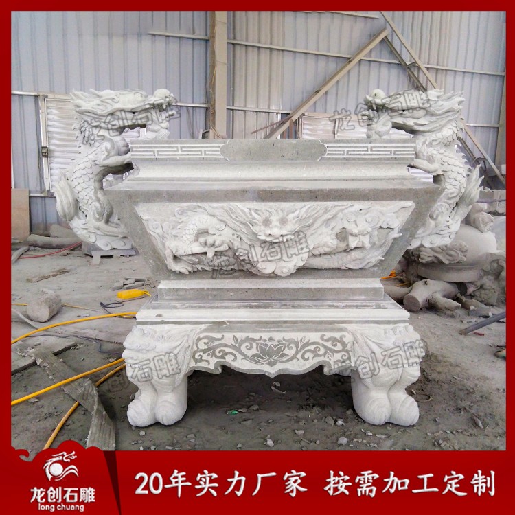 石雕香爐定做找龍創石雕,我司專注石雕工藝品二十余年,匠心制作、品質保證。石雕香爐一般都用于日常供奉神明之用,寺廟石雕香爐的款式種類有很多,大的、小的、方的、圓的、長的、短的造型不一。通常會在爐身的四周雕刻龍鳳與祥云圖案,寓意龍鳳呈祥,陰陽和諧。或者雕刻祥云花卉等圖案,雕刻技藝嫻熟的人雕刻出來的成品富有一定的靈性。