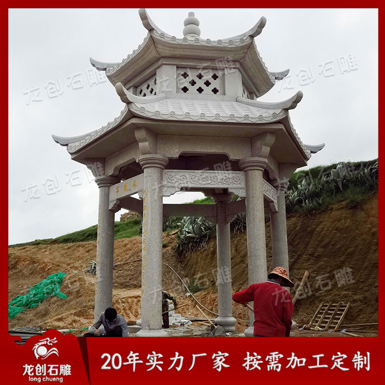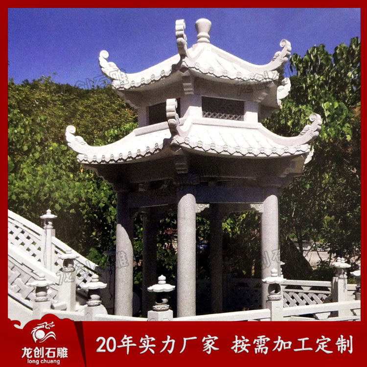 石雕雙層涼亭作為一種景觀建筑,經常的與空間環境作為主題形式出現。這樣我們可以從各個角度欣賞。但是它又不是一個實體,更多地強調其虛空的內部與周圍的空間環境之間的聯系,這樣就通過建筑造型的外在形象,在周圍空間中起到點睛的作用。它追求的是一種整體美、自然美、古典美。