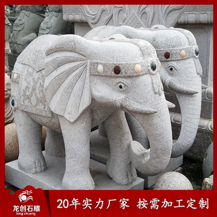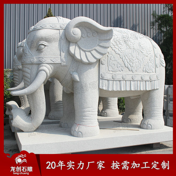 石雕大象造型各異,從鼻子來看,就有分鼻子朝上、鼻子朝下、鼻子朝內、鼻子朝外。象諧“祥”音,所以常有吉象之稱,適合擺放在酒店別墅、企業、寺廟門口等各種場景。