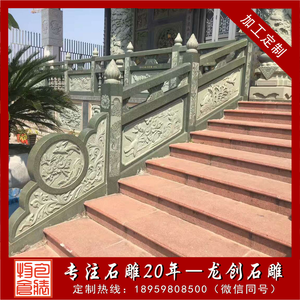從欄桿的雕刻用料看,普通青石、綠色青石等是比較基礎(chǔ)的雕刻材料,普通青欄桿價(jià)格在500-700元左右,根據(jù)雕刻建造情況,欄桿的價(jià)格也都會(huì)有所不同。考慮到現(xiàn)在特殊區(qū)域使用需求,也有不少選擇綠色青石欄桿或者綠山巖欄桿,高的話達(dá)到1000元以上等等。