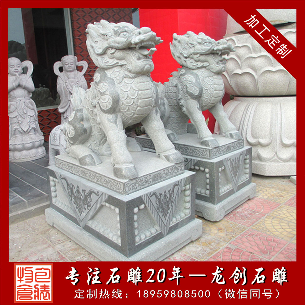 第1,麒麟造型的設計。麒麟是個傳統的吉祥符號,在中國傳統文化中占有重要的地位。一對石雕麒麟如果造型講究的話,那么價格也會比較高。石雕麒麟的作用有很多種,可以是活潑可愛的,也可以是沉穩內斂的,還可以是俏皮的等等,無論什么造型的麒麟,只要是有一定的特點只要是造型精致的,那么這樣的作品價格也比較高。